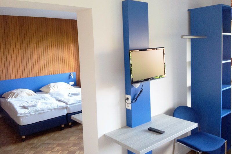 Unsere Standard Doppelzimmer finden Sie sowohl in der ersten als auch in der zweiten Etage unseres Hauses. Sie sind ausgestattet mit einem Bett ca 180x200cm. Alle Doppelzimmer verfügen über WC/Waschbecken/Dusche, sowie sorgen gratis Wlan und ein Smart-LED-TV in jedem Zimmer für ein Plus an Entertainment, während mehrere Desinfektionsstationen im Haus verteilt, sowie diverse Hygieneprodukte im Zimmer ein Höchstmaß an Sicherheit garantieren. Bettwäsche und Handtücher sind bei uns selbstverständlich inklusive und für eine kleine Mahlzeit zwischendurch stehen der Wasserkocher im Zimmer, sowie ein gut gefüllter Kühlschrank mit Getränken und Snacks im Flur bereit.